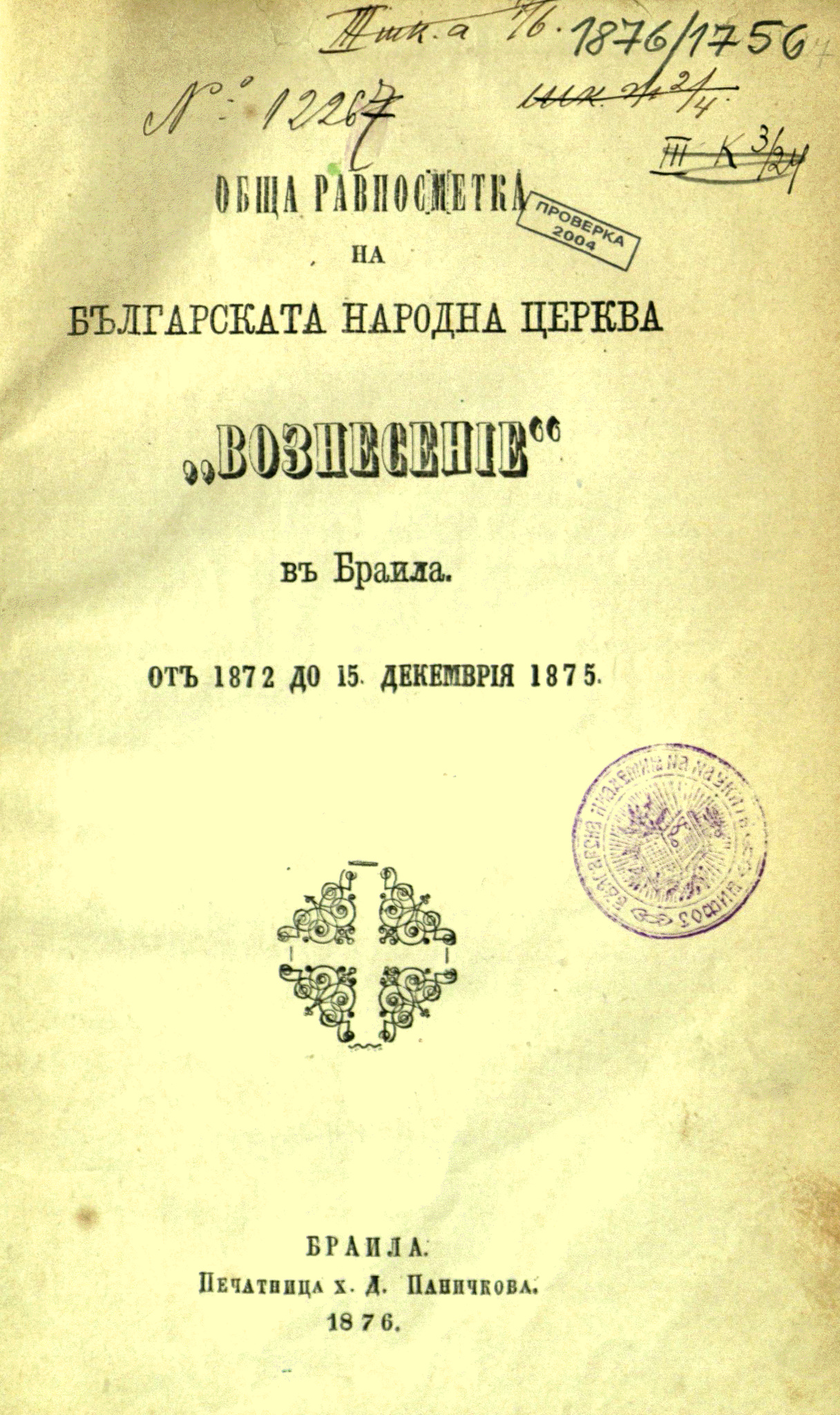Обща равносметка на Българската народна церква "Вознесение" в Браила от 1872 до 15 декемврия 1875