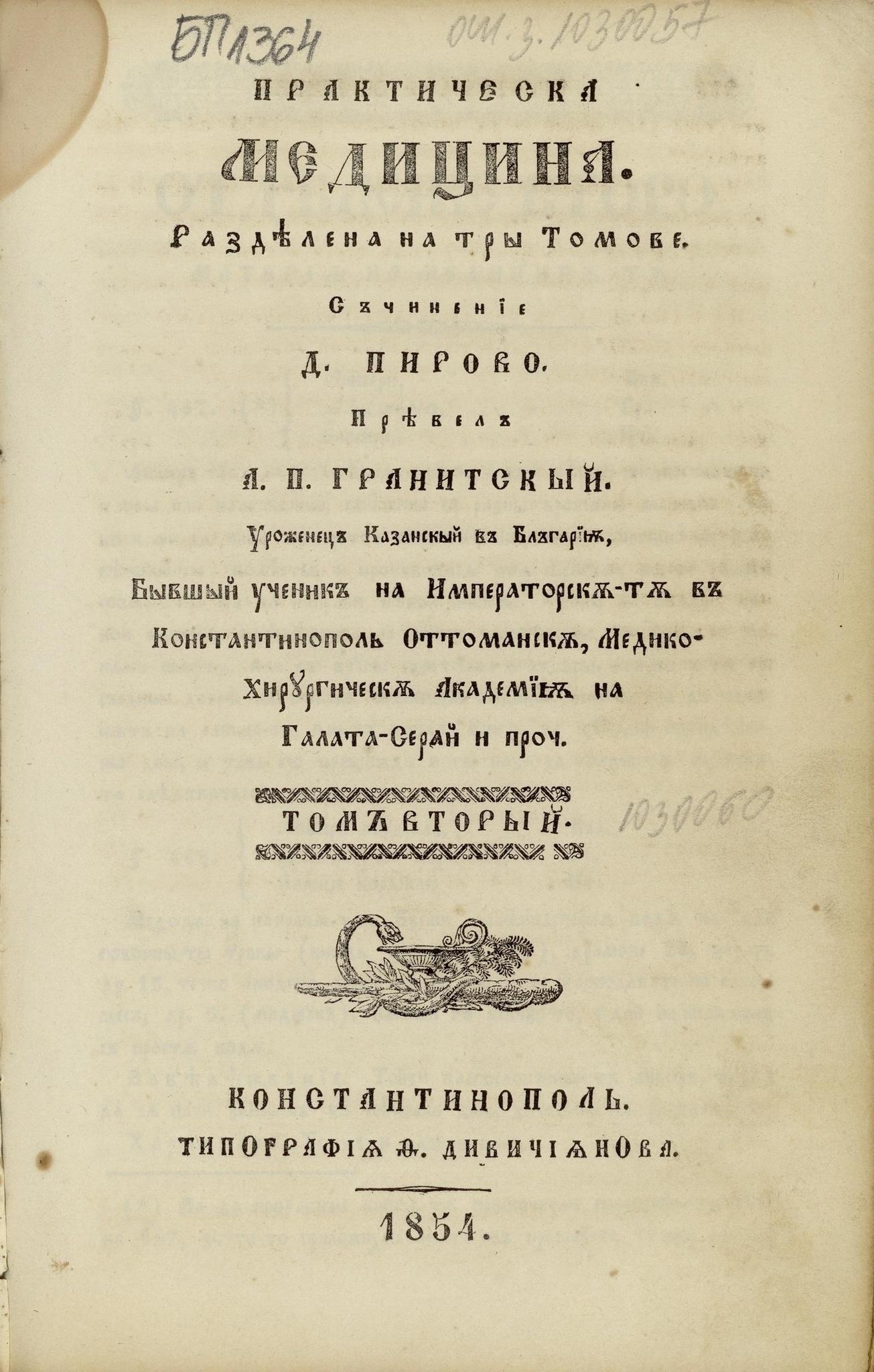 съчинение Д. Пирово; преведе на блъгарски, [предисловие] Анастасий П. Петрович Гранитский от Котел или Казан в България, бивший ученик на Императорската в Константинопол отоманска медико-хирургическа академия на Галата-Серай и...