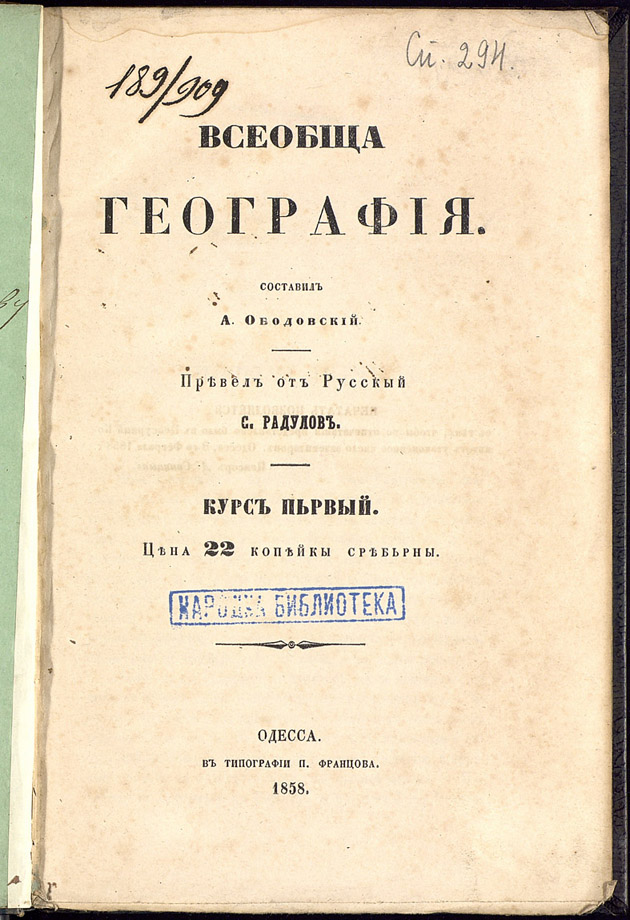 списана на францушки от Н. Малуфа; преведена и попълнена с някои приложения от П. Р. Славейков; издава са с позволението на Министерството просвещения за употребение в българските училища