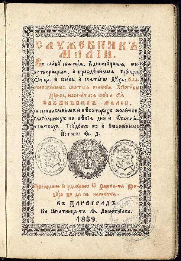 напечатано повелением русскаго министра внутрешних дел в 1846 лето; а преведено от того язика на болгарски от Захария Княжеский